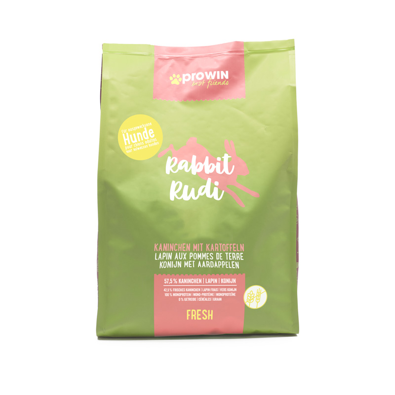 Vers konijnenvlees 42,5%, erwten, aardappels 15%, konijneneiwit (gedehydreerd) 15%, kippenvet, konijn (gehydrolyseerd) 3,2%, mineralen, gist, appels gedr., cranberry gedr., wortels gedr., tomaten gedr., spinazie gedr., Yucca schidigera